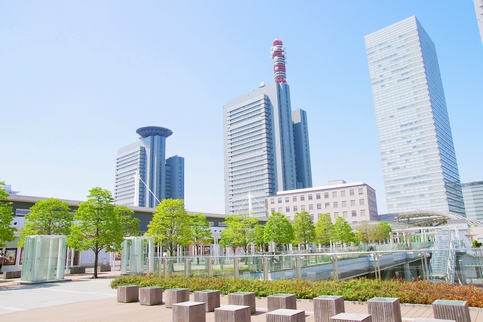 駅前・都会的な通路・ビル郡・街中・バスやタクシーが停まるロータリー・駐車場わきの公園など!